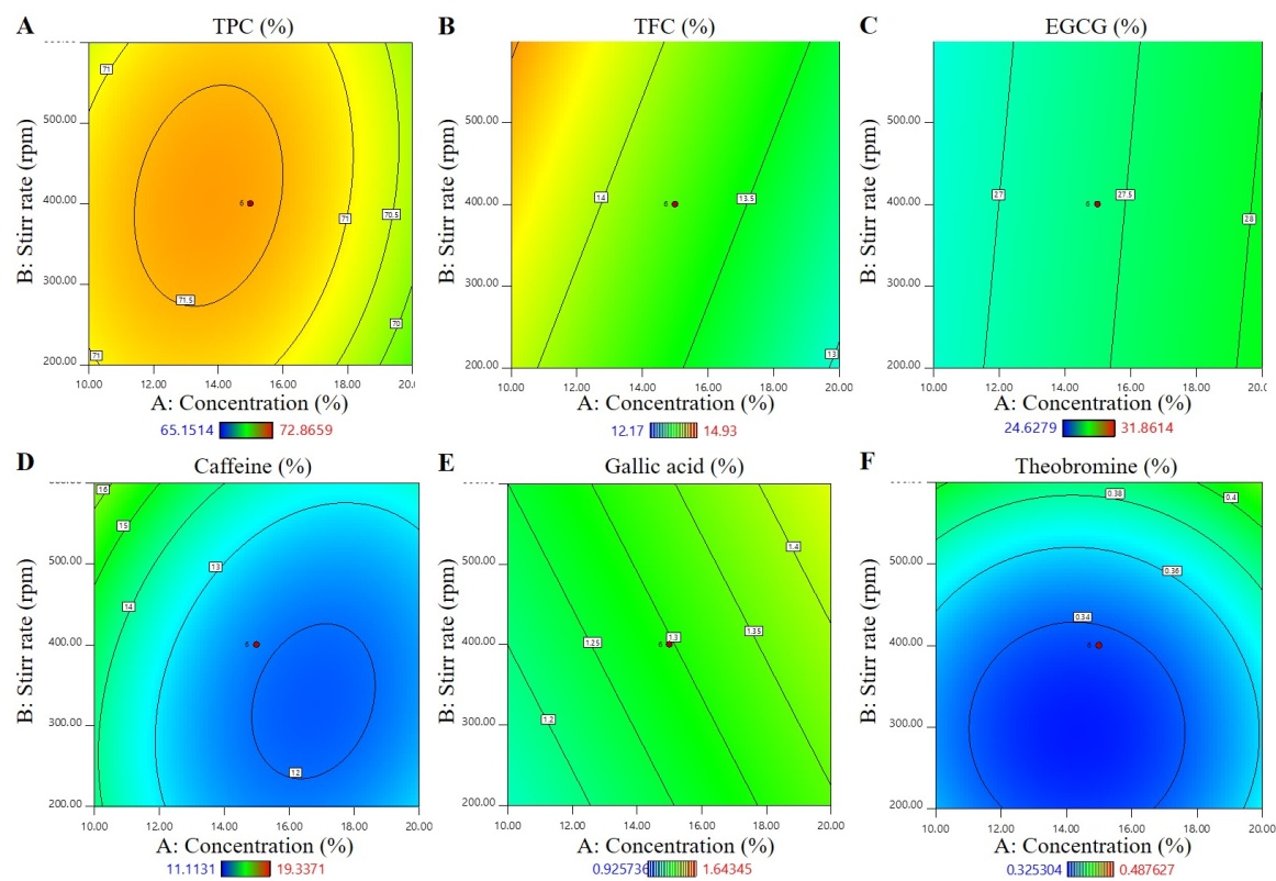 Fig. 2: Contour plots from TPC (A), TFC (B), EGCG (C), caffeine (D), gallic acid (E), and theobromine (F) responses