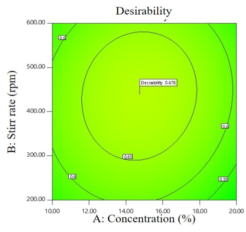 Low or too high concentrations and stirring rates tend to reduce yields. The optimal yields are marked in the reddish-orange area (fig. 1-C and 1-D). The p-value in the Y1 model is less than 0.05 indicating a significant model requirement. In this case factors A, C, A², B², C² are significant models with the selected type of model is quadratic. The yields (Y1) will be optimal in a specific concentration range (A) and decrease the yields by increasing the concentration (A²). The addition of extraction time (C²) will reduce the yields; the more extraction time is indeed not desirable in production. The stirring rate (B) affects the yields, especially the increase in stirring will reduce the extracts.