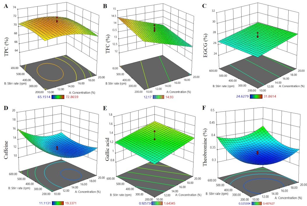 Fig. 3: 3D surface plots from TPC (A), TFC (B), EGCG (C), caffeine (D), gallic acid (E), and theobromine (F) responses