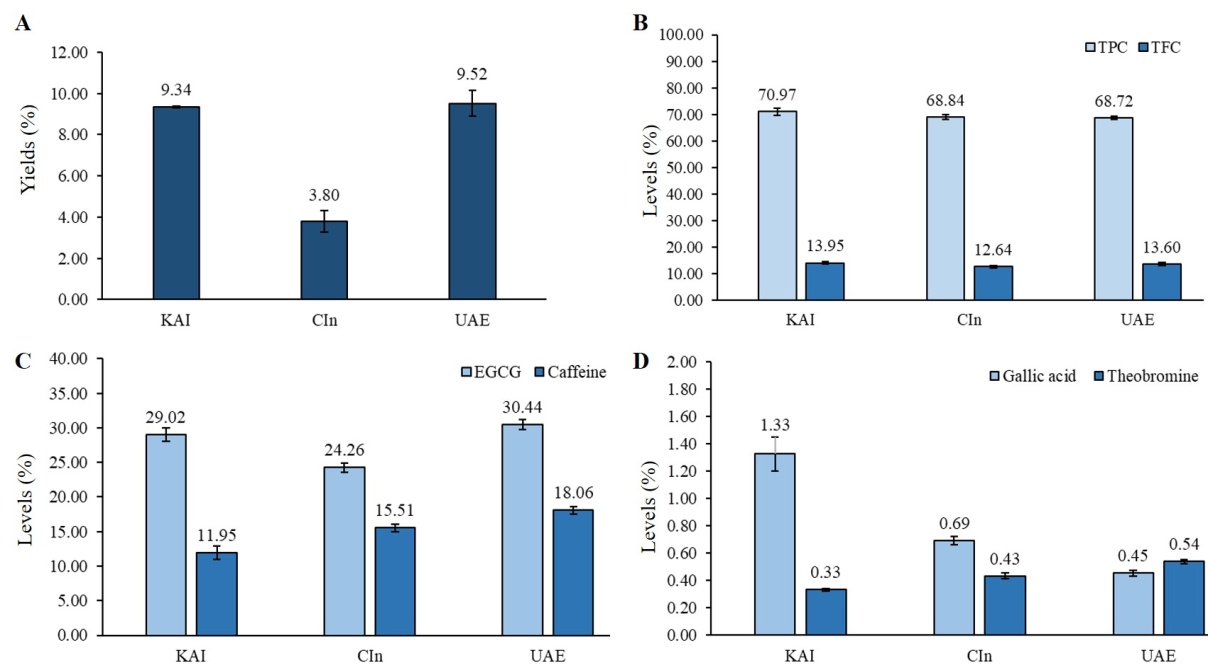 Fig. 6: Comparison of white tea extract using KAI, CIn, and UAE, yield of extracts (A), TPC and TFC (B), EGCG and Caffeine (C), and gallic acid, and theobromine (D), (n=6)