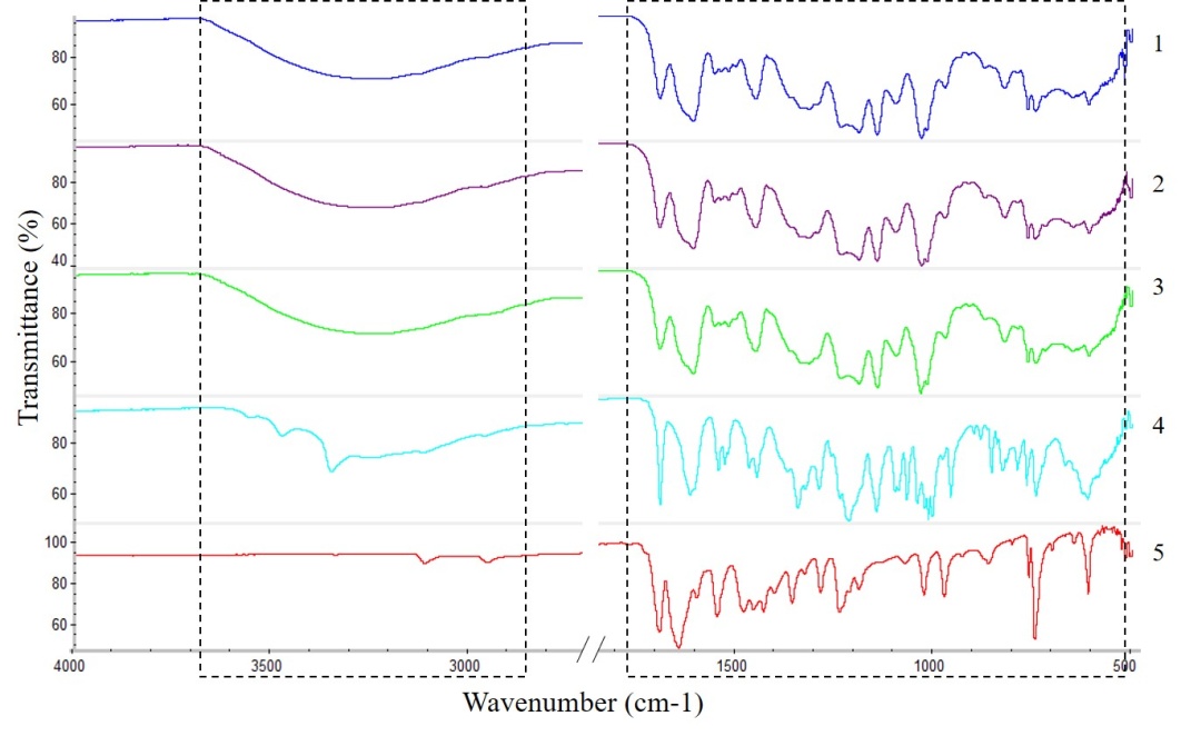 Fig. 7: FTIR-UATR spectra of white tea extracts using KAI (1), CIn (2), UAE (3), standard EGCG (4), and caffeine (5)