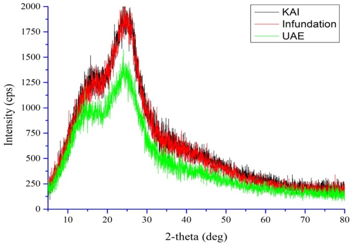 Fig. 8: The XRD pattern semi-purified extracts of white tea using KAI (black), CIn (red), and UAE (green)
