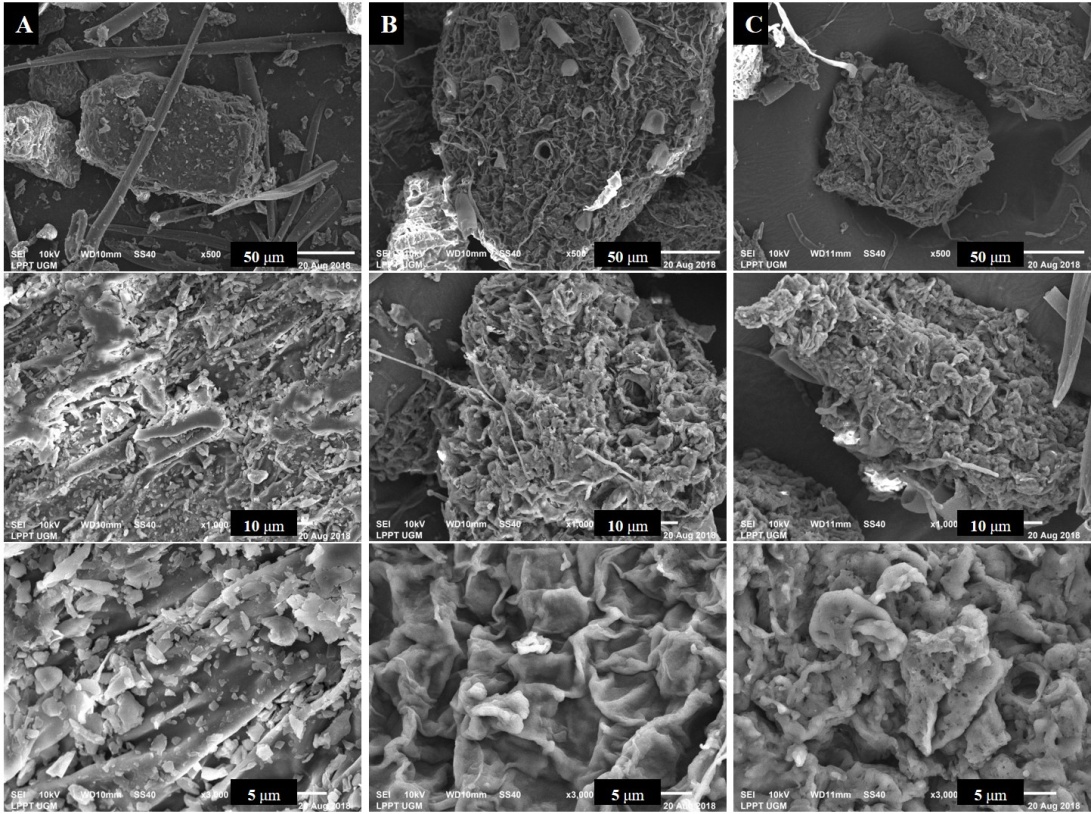 Fig. 9: SEM micrograhp of powder white tea before extraction (A), after extraction using KAI (B), and CIn (C)
