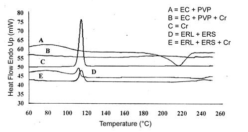 The physicochemical compatibility between the drugs and polymers used in the patches was studied by using differential scanning calorimetry (DSC). The sample was heated between 30 °C and 300 °C at the rate of 10 °C/min in an atmosphere of nitrogen (20 ml/min). The thermograms obtained for the drug, polymers, physical mixture of drugs with polymers and formulation (patch) were compared.