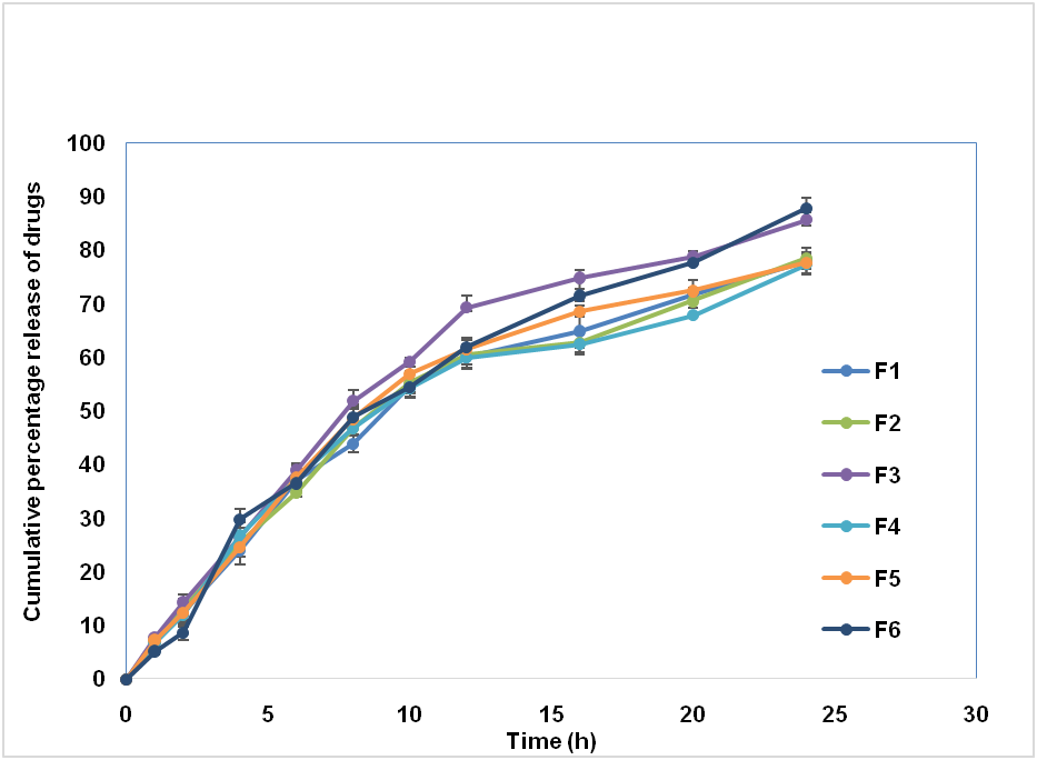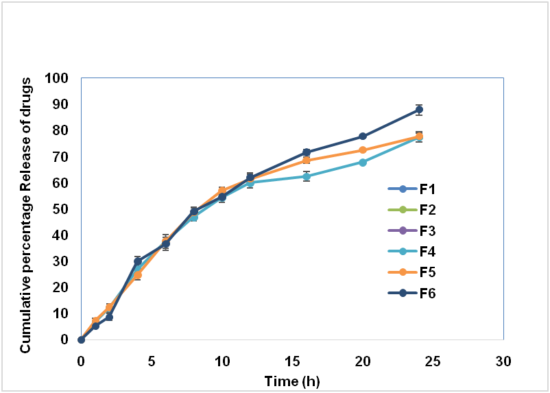 Fig. 2: Release profiles of ethinylestradiol and medroxyprogesterone acetate from formulations F1-F6. All values are expressed as mean±SD (n=3)