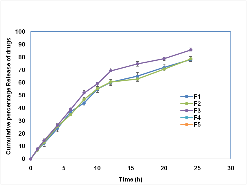 The in vitro release was carried out with the semipermeable membrane using open-ended cylinder. The cylinder consists of two chambers, the donor and the receptor compartment. The donor compartment was open at the top and was exposed to an atmosphere. The temperature was maintained at 37±0.5 °C and receptor compartment was provided with sampling port. The diffusion medium used was phosphate buffer (pH 7.4). The drug-containing patch with support of backing membrane was kept in the donor compartment and it was separated from the receptor compartment by the semipermeable membrane. The semipermeable membrane was previously soaked for 24 h in phosphate buffer (pH 7.4) the receptor compartment containing 300 ml phosphate buffer (pH 7.4) in a beaker was maintained at 37±0.5 °C and stirred at 50 rpm with magnetic beads operated by a magnetic stirrer. A sample of 1 ml was withdrawn at predetermined time intervals and replaced with fresh buffer. The concentration of drug was determined by spectrophotometrically at 280 nm. The cumulative amounts of drug permeated per square centimeter of patches were plotted against time [15, 25].