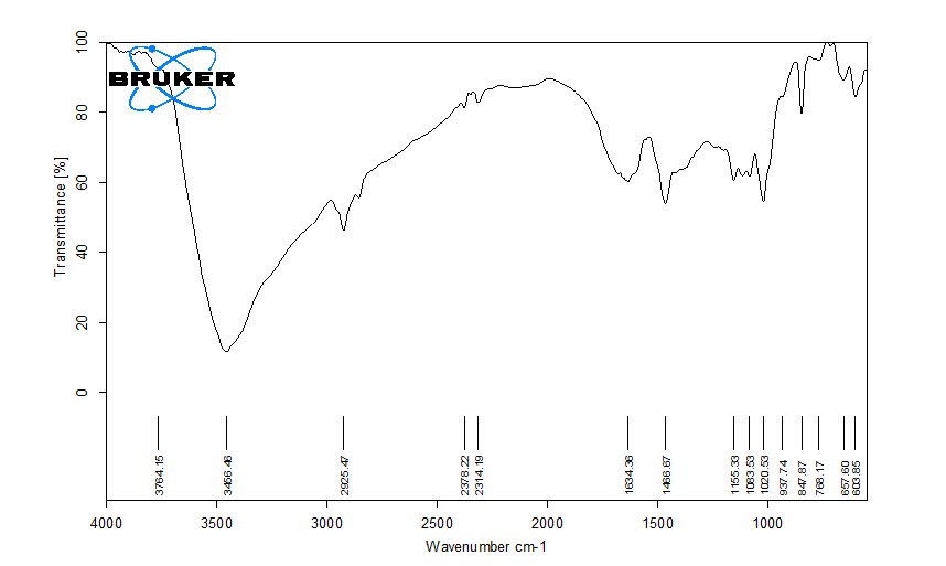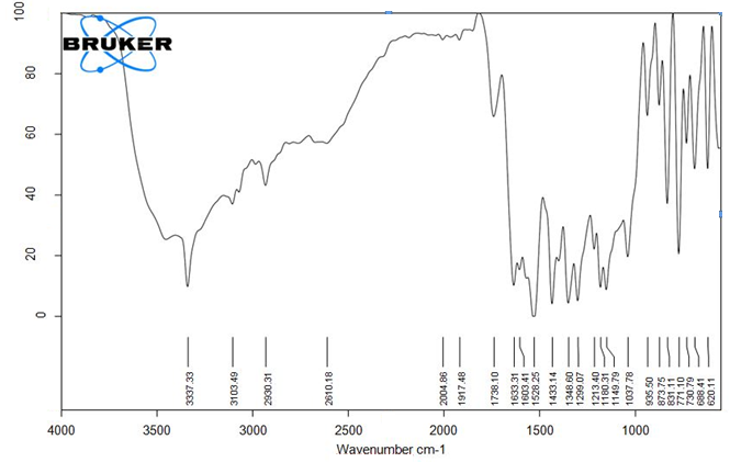 FTIR spectra of starch tartrate were recorded on samples prepared in potassium bromide (KBr) disks using a BRUKER FT–IR,(Tokyo, Japan). The scanning range was 500 to 4000 cm-1. Samples were mixed with (KBr) to form disks by means of a hydrostatic press at 6-8 tons pressure [8].