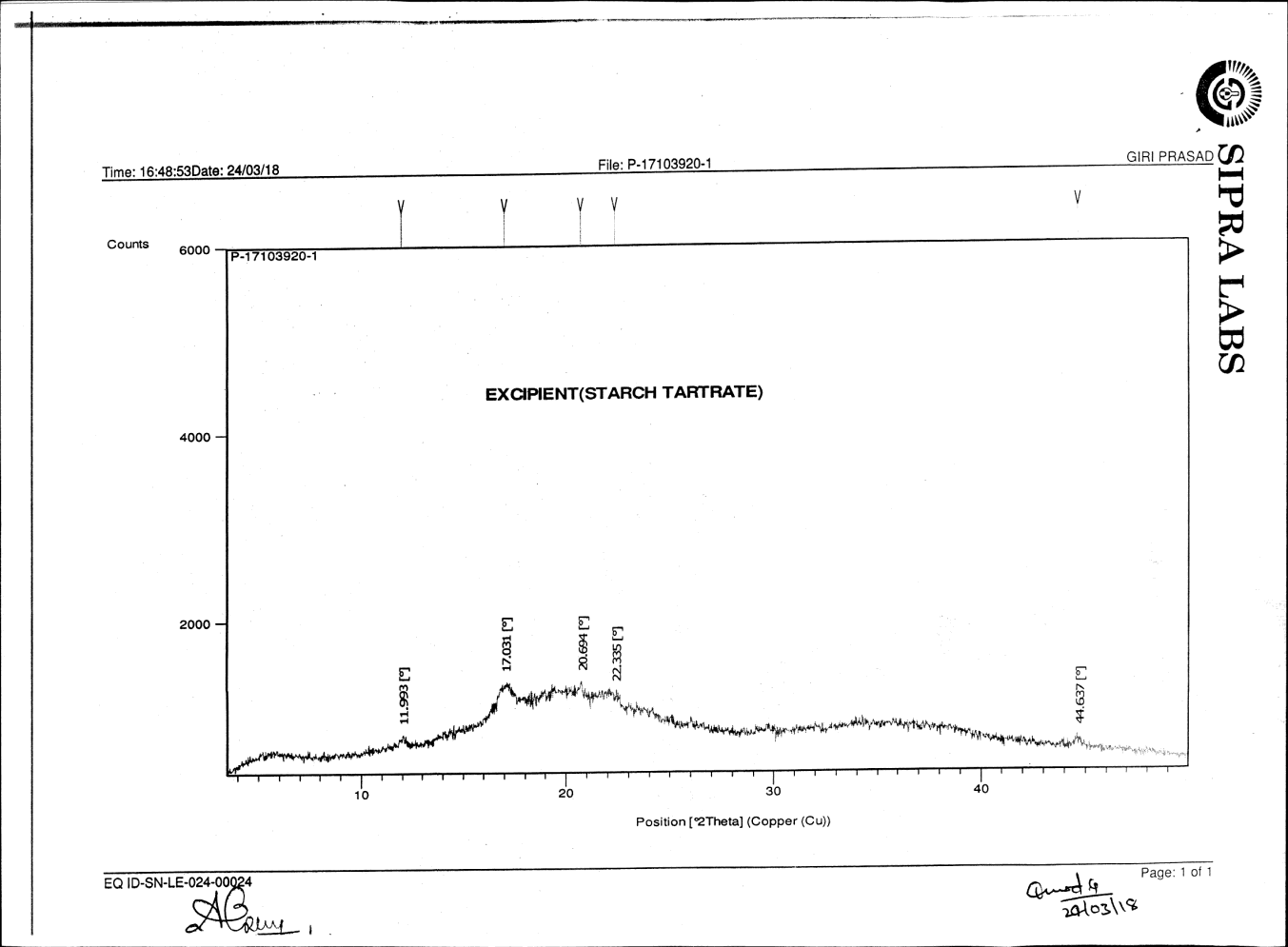 Starch tartrate exhibited good swelling in water. The swelling index was found to be 100% indicating that it is suitable for superdisintegrant. All micrometric properties indicated good flow properties needed manufacturing of tablets. The density of starch tartrate was found to be 0.625 g/cc. The angle of repose and compressibility index showed good flow properties of starch tartrate. The FTIR spectrum of potato starch and starch tartrate is shown in fig. 1 and 2. The presence of peaks absorption at 1736.63 cm-1 characteristic peaks of ester, so from FTIR studies it was concluded that starch tartrate (ester) was formed when starch was allowed to react with tartaric acid. The X-ray diffraction pattern (fig. 3) of starch tartrate showed characteristic peaks, which indicates that the structure is slightly crystalline. The disappearance of pink color in the ester test confirmed the presence of ester, i.e., starch tartrate. As the starch tartrate was slightly crystalline powder and it had got all the characteristic of superdisintegrants it was concluded that starch tartrate can be used as novel superdisintegrant in the formulation of fast dissolving tablets.
