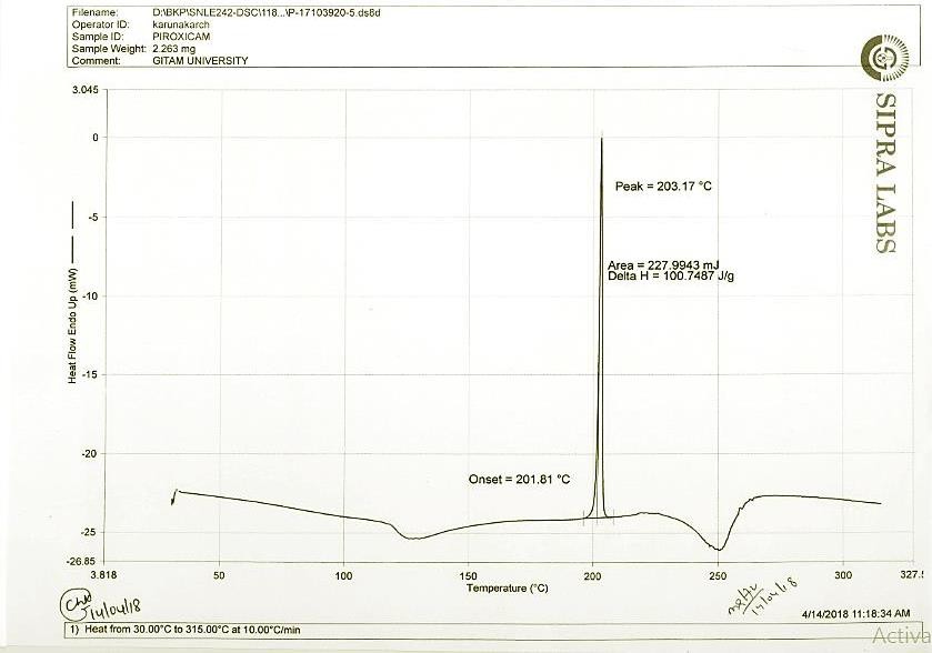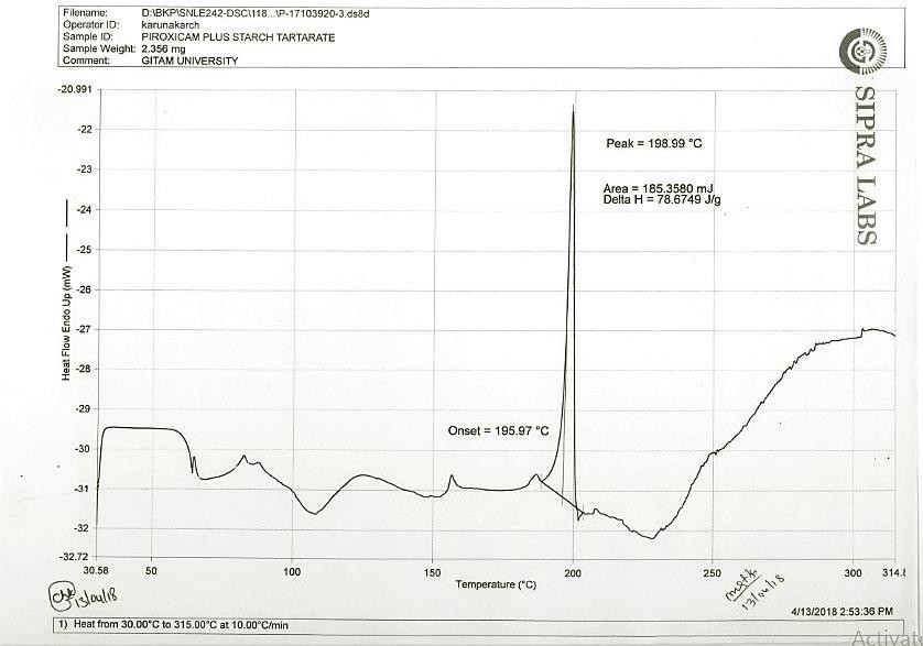 DSC thermograms of piroxicam and their mixtures (1: 1) with starch tartrate were recorded on Perkin Elmer thermal analyzer samples (2-5 mg) were sealed into aluminum pans and scanned at a heating rate of 10 °C min-1 over a temperature range 30–350 °C [8].