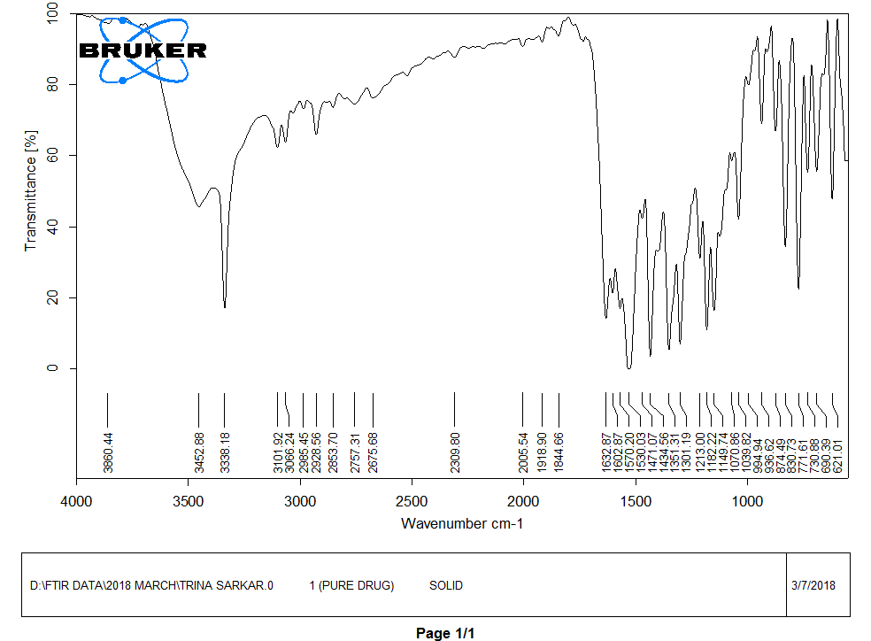 Fourier transform infrared (FTIR) spectra of piroxicam and their mixtures (1: 1) with starch tartrate were recorded on a Perkin Elmer, IR Spectrophotometer model: Spectrum RXI, using KBr disc as reference [8, 9].