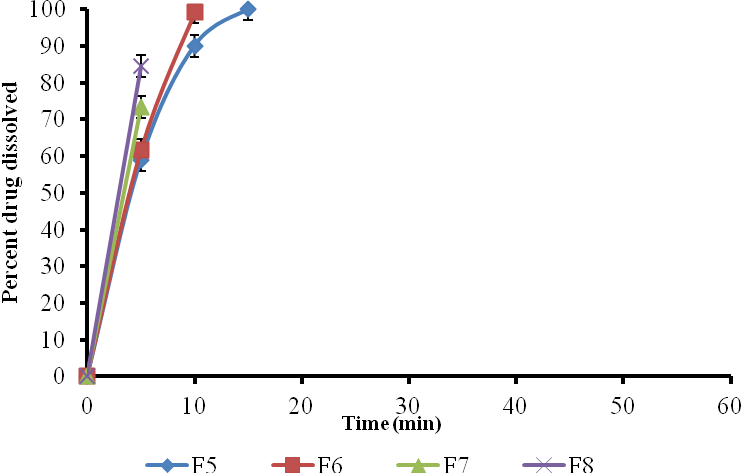 Fig. 10: Dissolution profiles of piroxicam fast dissolving tablets (F5-F8) (n=3, mean±SD)