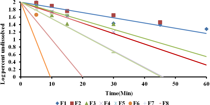 Fig. 10: Time Vs Log percent drug undissolved plots for piroxicam fast dissolving tablets (F1-F8) (n=3, mean±SD)