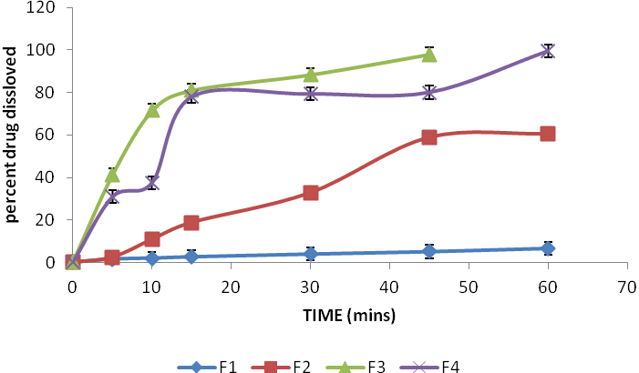 Fig. 9: Dissolution profiles of piroxicam fast dissolving tablets (F1-F4) (n=3, mean±SD)