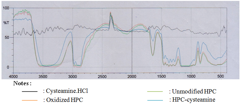 The spectra of HPC-cysteamine as shown in fig. 2 in the range of 800–2300 cm−1 and around 2500 cm−1 displays comparatively flat as shown by that of cysteamine. This could indicate the presence of S-H in HPC-cysteamine conjugate. In addition, HPC-cysteamine shows broader spectra compared to unmodified HPC and oxidized HPC in the range of 3310–3500 cm-1and of 2500–2900 cm-1 to demonstrate the the presence of secondary amine and free thiol groups, respectively as results of the conjugation [16].