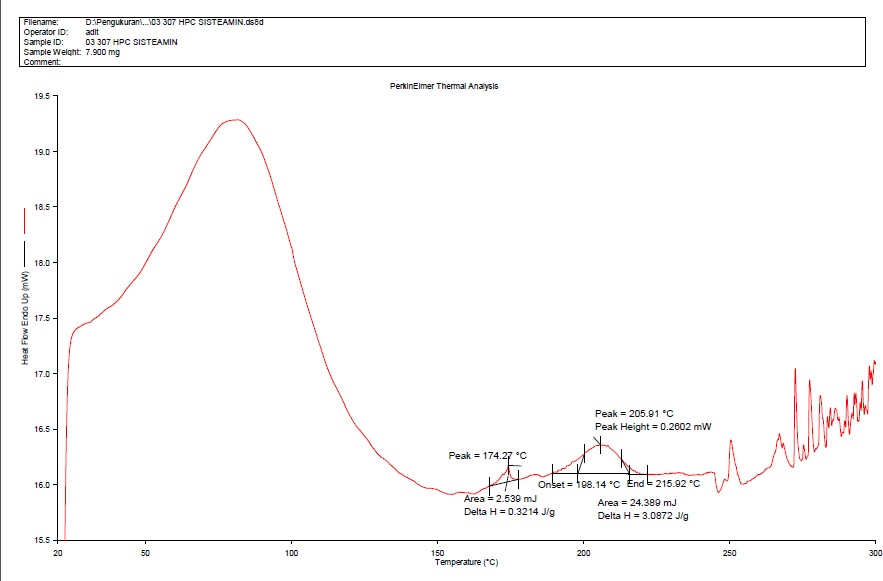 The DSC patterns of unmodified HPC and HPC-cysteamine were investigated using a PerkinElmer Thermal Analysis at a scanning rate of 10 °C/min from 20 to 300 °C under nitrogen gas stream at a flow rate of 40 ml/min. Unmodified HPC and HPC-cysteamine of 3-5 mg were precisely weighed and put into flat-bottomed aluminum pans [12].