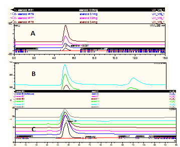 Fig. 1: Chromatograms of atenolol using HPLC A: in standard solutions for concentration between 0.05-2 mg/ml; B: in samples taken from Franz diffusion cell after 1-24 h; C: in blood samples after transdermal application between 1-24 h
