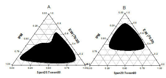 The three-phase diagrams were established for MEs composed of IPM, water, ethanol and a mixture of tween 80: span 20 (3:2) without atenolol (fig. 2A) and with 100 mg atenolol (fig. 2B).