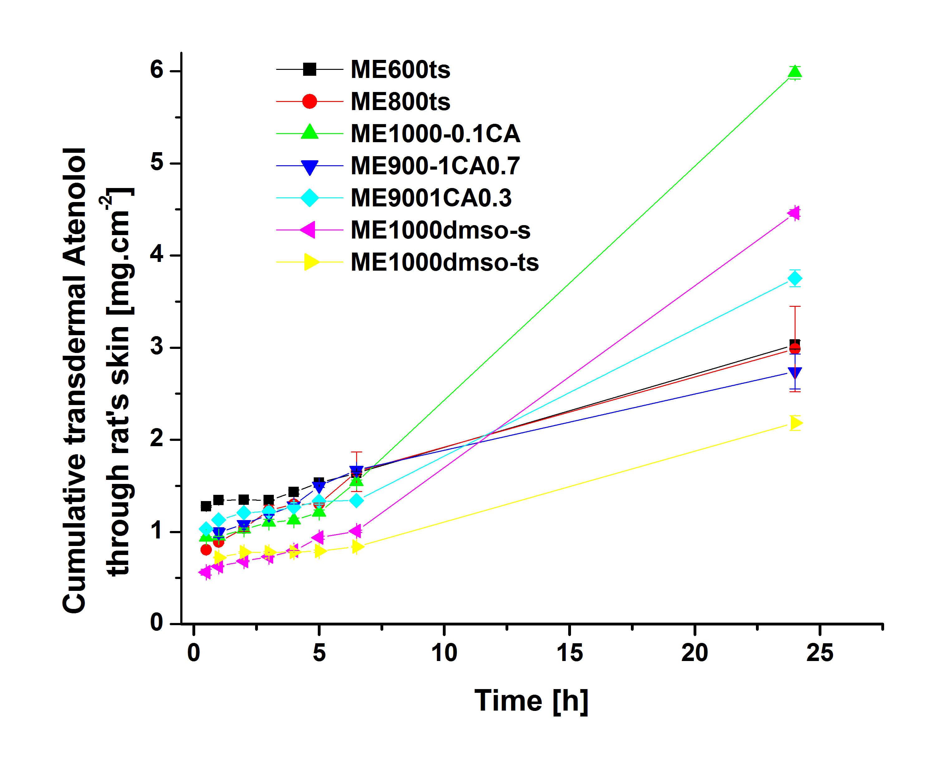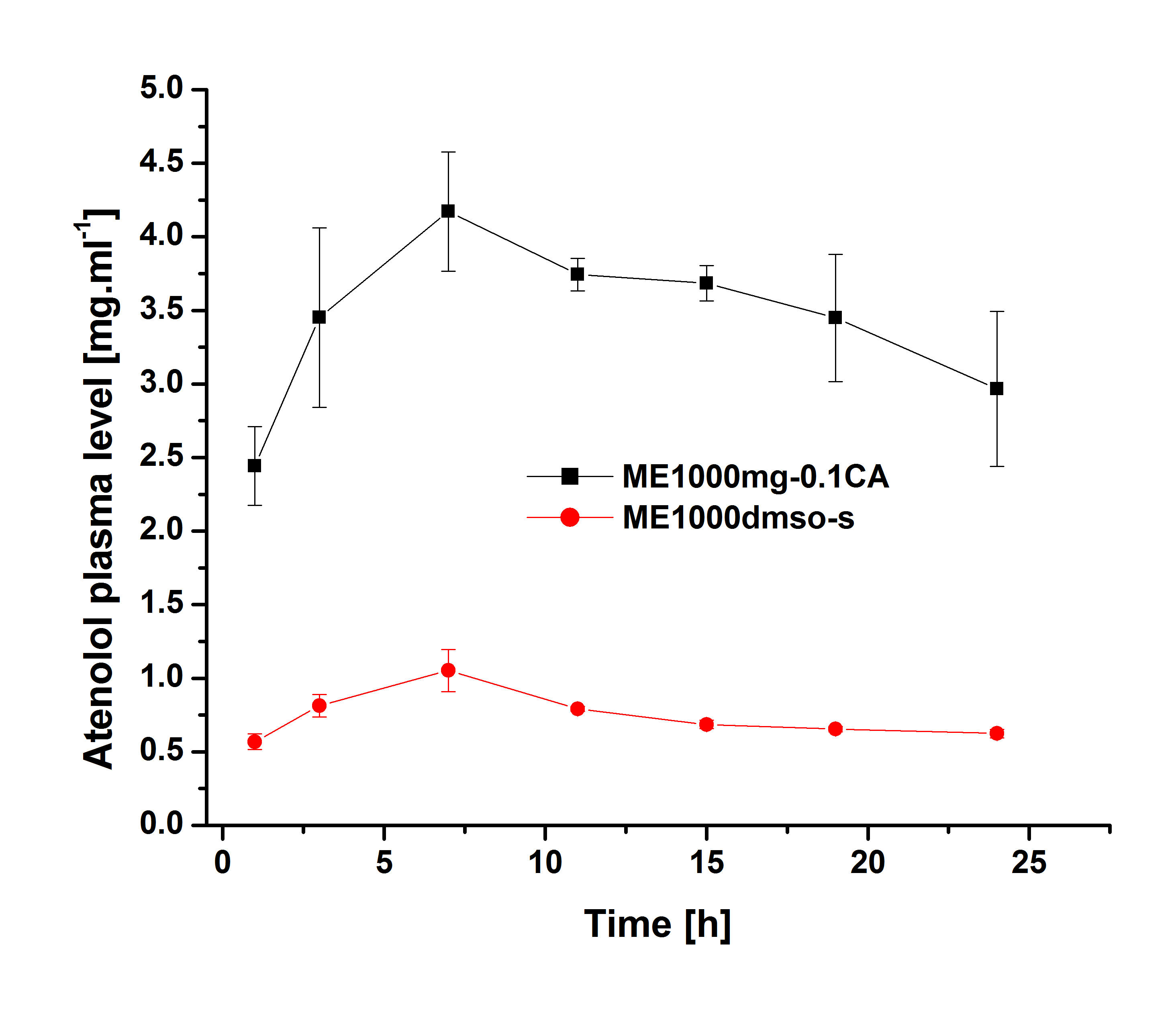 ME1000-0.1CA showed higher flux and bioavailability in comparison to ME1000dmso-s which may be associated to the lower droplet size and the higher concentration of atenolol in ME1000-0.1CA compared to ME1000dmso-s. Furthermore, the transdermal application of both two systems maintained a high plasma level over 24 h during the investigation.