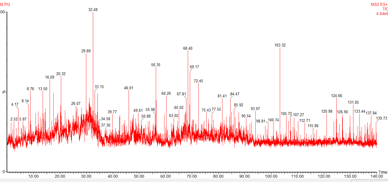With LC, the obtained peptides would be separated based on an interaction between peptides and stationary phase, as indicated with certain retention times. Fig. 2 revealed LC chromatograms of peptides obtained from digestion of porcine gelatin and bovine gelatin. In addition, fig. 3 revealed LC chromatogram of peptides in porcine gelatin mixed with bovine gelatin previously digested using trypsin. The results of this study exhibited that it is possible to differentiate the peak markers playing an important role in such differentiation, corresponding to specific peptides composed of porcine and bovine gelatins.