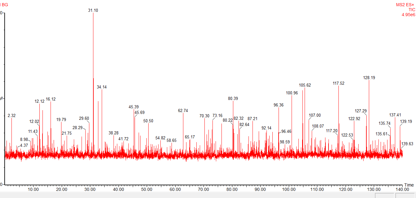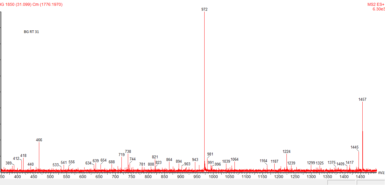 Mass spectra of each peaks with specific retention time indicated peptides with certain fragmentation pattern. Fig. 4 was an example of fragmentation pattern of peptides obtained from porcine gelatin digested with trypsin at retention time (tR) of 3.1 with main peak with maximum abundance at m/z = 972, along with other ion fragments.