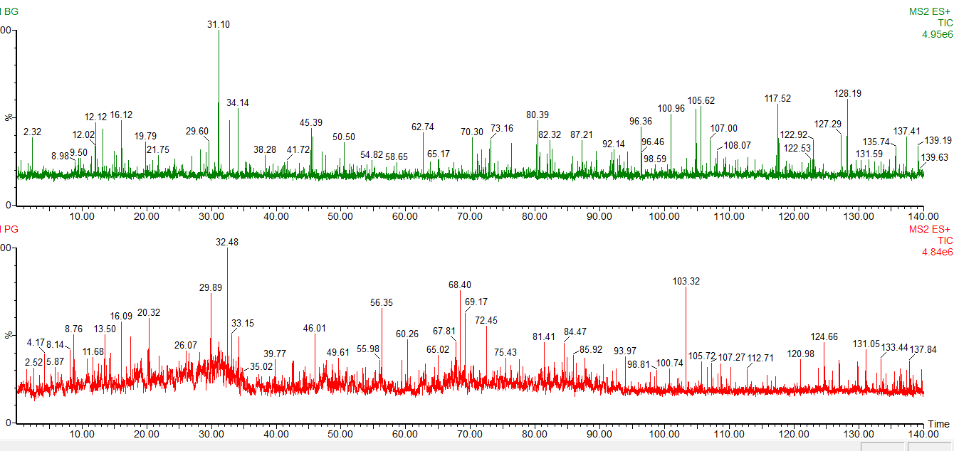 Fig. 2: The LC chromatograms of peptides obtained from digestion with trypsin enzyme of porcine gelatin (above) and bovine gelatin (below)
