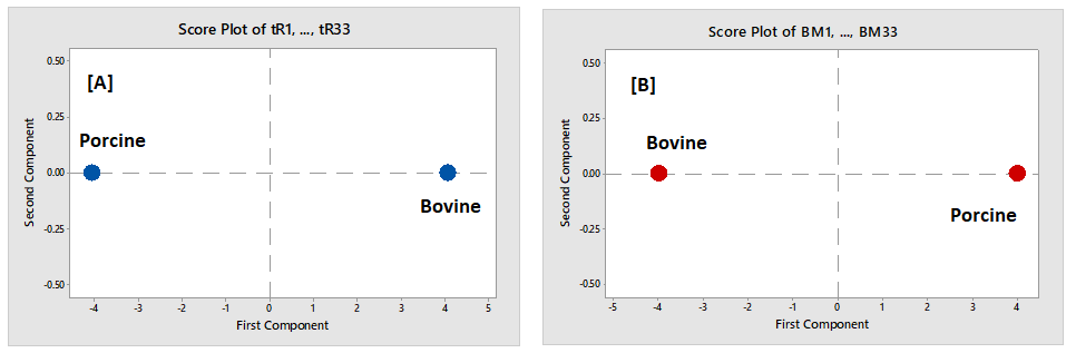 The chemometrics of principal component analysis (PCA) was used for classification of porcine and bovine gelatins. PCA is unsupervised pattern recognition technique commonly used for sample classification, based on certain variables. PCA was done using Minitab software version 17 (Minitab Inc., USA).