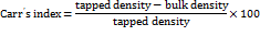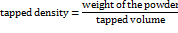 The cylinder was allowed to fall under its own weight onto a hard surface from the height of 2.5 cm at 2-second intervals. The tapping was continued until no further change in volume was noted. Tapped density was calculated using the following formula [12].