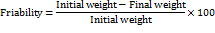 The hardness of three tablets was measured by Monsanto hardness tester. Hardness of tablets was measured in terms of kg/cm 2 Friability of tablets was measured by using Roche friabilator. Ten tablets were accurately weighed and placed in the friabilator and operated for 100 revolutions. The tablets were dedusted and reweighed and friability was calculated using the following equation [14].