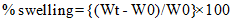 The tablets were weighed (W0) and placed in a petridish containing buffer and incubated at 37±1 °C. At regular time intervals until 12 h, the tablet was removed carefully and the excess buffer was removed with blotting paper. The swollen tablet was then reweighed (Wt) and the percent swelling was calculated as follows: