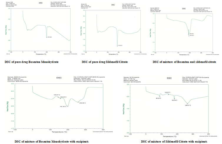 The thermograph of pure drug bosentan monohydrate showed the melting point to be 197.94 °C and of sildenafil citrate 187.30 °C, which is as reported in the literature. The thermographs of the mixture of both drugs, as well as drug and excipient mixtures, does not reveal a significant change in the melting points of bosentan and sildenafil, thus ruling out in-compatibilities as depicted in fig. 1.
