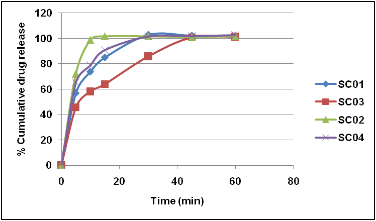 From the four batches of sildenafil citrate, SC01 containing croscarmellose sodium as disintegrant showed optimum drug release of 102.96% within 30 min. Hence this blend was further selected to be compressed against the 12 batches of bosentan monohydrate sustained release blends.