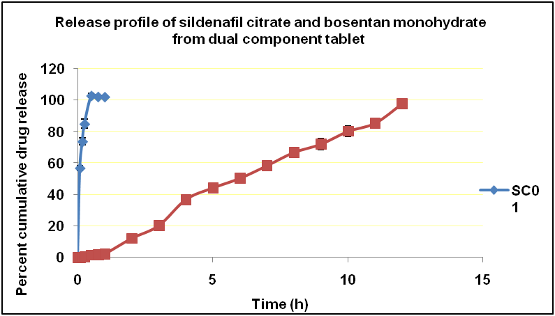 Stability results of the optimised batch BS09 showed optimum drug release of sildenafil citrate within 30 min and controlled release of bosentan over a 12 h period.