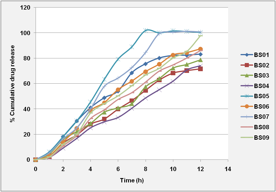 The release of sustained release bosentan monohydrate from the 12 batches of bilayer tablets is as given in fig. 3. All batches showed drug release varying from 8-12 h depending on the concentration of independent variables. Batches BS01-BS04 that do not contain solubiliser SLS do not show complete drug release at the end of 12 h. This may be attributed to the saturation of the drug released in the dissolution vessel after 5-6 h. Formulations BS05-BS09 containing SLS as solubilizer showed adequate drug release. Formulations BS05 and BS07 containing 30 mg of HPMC K4M DC2 Premium per tablet could control the release for 8-9 h, whereas formulations BS06 and BS08 containing 50 mg HPMC showed adequate control for a 12 h period as desired. Pregelatinized starch was observed to have a synergistic effect along with HPMC on controlling the drug release. Formulations BS09 which was the center point batch containing 40 mg HPMC, 30 mg pregelatinized starch and 5 mg SLS per tablet was observed to be the best-optimised formulation. The dissolution profile of the optimised bilayer tablet is depicted in fig. 4.