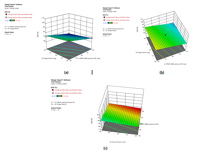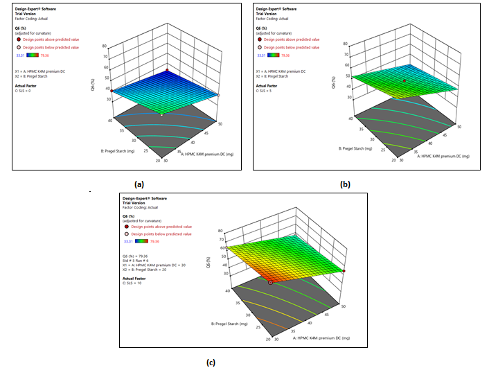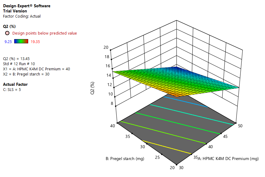 To describe the entire dissolution profile, three-time points were considered in the design expert software. Fig. 5 shows the response surface plot for drug release at 2 h (Q2). As depicted, as the concentration of HPMC increases from 30 mg to 50 mg per tablet, the percent drug released is controlled. The same phenomenon is observed with pregelatinized starch as well, but to a lesser extent than HPMC. SLS does not have a significant effect at 2 h.