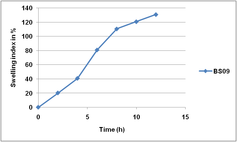 The statistical data obtained from ANOVA for the models is represented in table VII. From the ANOVA analysis, it can be observed that HPMC K4M DC2 Premium(X1) polymer has effect on all responses Q2, Q6 and Q10reinforcing the fact that it is the main release retarding polymer that controls the drug release upto12 h. At two hours the coefficient, as observed from the equation in table 7 has a lesser value as this is the period of establishment of a fully swollen gel matrix. This is also reinforced by the swelling index of the tablet as depicted in fig. 8 for optimised batch BS09. It was also observed that as the HPMC content per tablet increases the swelling index also increases. Pregelatinized starch has significant influence at 6 h as observed from the equation in table. It forms a synergistic gel matrix with HPMC. The influence of SLS as solubilser for drug is most predominant from 6 h onwards till 12 h. Since P<0.05 for all three responses, indicates that the model is significant. R2values indicate a high level of correlation between experimental and predicted responses. The closeness of the adjusted and predicted R2 values explains the reliability of the model. The adequate precision value of greater than 4 indicates that the model is discriminating. Since coefficient of variation CV is less than 10 the model can be considered reproducible.