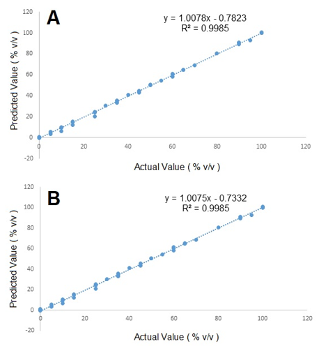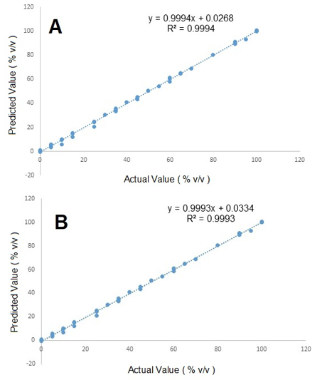 | Model | Spectra | Equation | R2 | RMSEC (%v/v) | RMSEP (%v/v) |