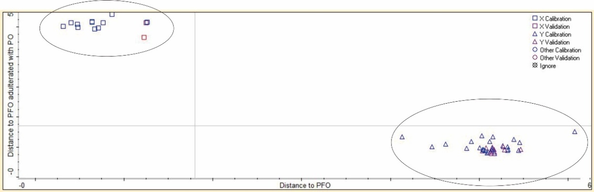 Conclusion: FTIR spectroscopy combined with chemometrics could be reliable technique for quantification and discrimination of PFO and PFO adulterated with PO.