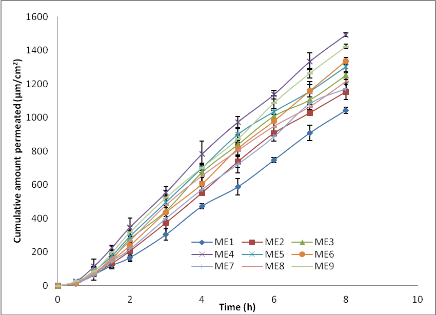 Fig. 3: Permeation profiles of ACF through rat epidermis from microemulsions. Bar represents mean±SD (n=3)