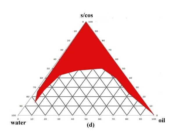Fig. 2: Pseudo-ternary phase diagrams of microemulsion composed of castor oil, surfactant (tween 80), co-surfactant (ethanol) and water. (a) S/CoS, 1:1 (b) S/CoS, 2:1 (c) S/CoS, 3:1 (d) S/CoS, 4:1