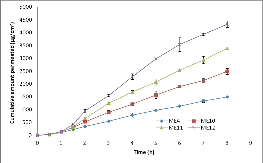 Further, to improve the permeation rate of ACF from microemulsion formulations menthol was added at 3% w/w, 6% w/w and 8% w/w in ME10, ME11 and ME12 formulations respectively. The obtained permeation profiles were showed in fig. 4 and the permeation parameters calculated from profiles were presented in table 3. The permeation rate (transdermal flux) of ME10, ME11 and ME12 formulations were found to be 311.54±14.80, 424.04±5.29, 540.79±15.05 µg/cm2/h and a lag time 0.68±0.14, 0.64±0.23, and 0.53±0.21 h respectively, which revealed that formulation contained 8% w/w menthol (ME12) showed the most pronounced enhancing effect with 2.9 fold increased in the permeation rate of ACF as compared to control (ME4; without menthol).