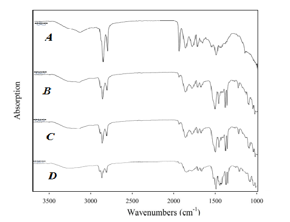 Fig. 5B: FT-IR spectra of rat SC treated with different concentration of menthol (A-without treatment, B-with 3% w/v menthol, C-with 6% w/v menthol, D-with 8% w/v menthol)