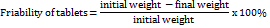 A total of 20 tablets were weighed, then the friability of tablets measured using friability tester Erweka TA-R with 100 rotations. The tablets were removed from the device, then cleaned it’s from the dust and weighed it’s again. The percentage of tablets friability can be calculated by the formula [19]:
