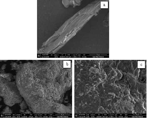 Fig. 4: Results of SEM analysis on HPC SL at M=1500x (a) and HPC BB at M=500x (b) and M=1500x (c)