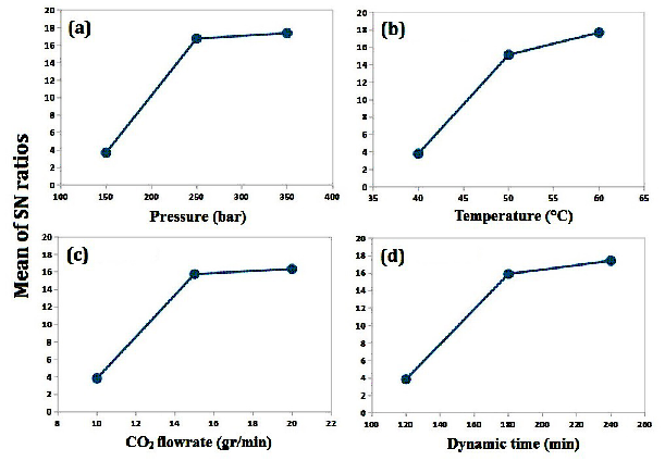 Fig. 1 shows the main effect plot of C. mangga oil yield to different extraction factors and levels. Main effect plot was performed based on the average response for each combination of control factor levels. It can be seen in fig. 1a that increased pressure from 150 to 250 bar resulted in a significant increment of C. mangga oil yield, while further increasing pressure from 250 to 350 bar resulted in a smaller oil yield increment. Generally, using a higher pressure at isothermal conditions resulted in an increased solvent density and subsequently solvent power and solubility of the compounds. An increase in CO2 density accelerated the mass transfer between analytes and solvent during the extraction process and thus it improved the extraction yield. As the density increased, the distance between molecules was decreased and the interaction between compounds and CO2 was increased, which led to a greater solubility of compounds in CO2 [14].