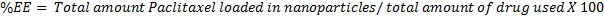 Entrapment efficiency of Paclitaxel-loaded solid lipid nanoparticle was estimated by the centrifugation method. The cooling centrifuge was used. In this method prepared solid lipid nanoparticles were placed in centrifugation tube and centrifuged at 2000 rpm for 20 min at 6-8 °C. The supernatant was withdrawn and pellets were washed with water. This was then kept in the cooling centrifuge at 15000 rpm for 40 min at 6-8 °C. The supernatant layer was removed and pellets were collected and diluted with methanol. By using UV spectrophotometer entrapped Paclitaxel was determined at 230 nm. The samples from pellets were diluted before going for absorbance measurement. The amount of paclitaxel loaded in pellets gives the total amount of entrapped drug. The concentration of drug was calculated from the straight line equation obtained from the standard calibration curve of Paclitaxel. Encapsulation efficiency is also expressed as a percent of drug trapped and was calculated using equation [17].