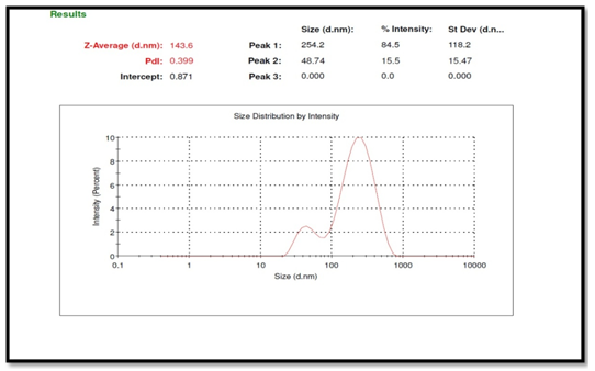 The particle size and polydispersity index (PDI) of prepared solid lipid nanoparticles were determined using a Malvern Zetasizer ZS90 (Nano series Malvern Instrument). Each sample was diluted 10 times with distilled water to avoid multiscattering phenomena and is placed in disposable sizing cuvette and analyzed the particle size and PDI. The ploydispersibility index was studied to determine the narrowness of particle size distribution. The size analysis of sample consisted of 3 measurements and results were expressed as mean size±Std. Deviation [15].
