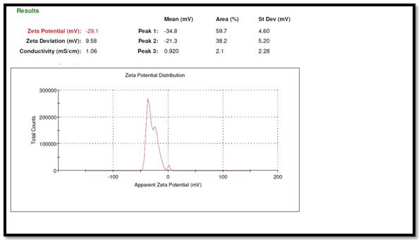 Zeta potential is the potential difference between the dispersion medium and the stationary layer of fluid attached to the dispersed particle. Zeta potential is a key indicator of the stability of colloidal dispersions. The magnitude of the zeta potential indicates the degree of electrostatic repulsion between adjacent, similarly charged particle in the dispersion. The zeta potential of prepared Paclitaxel solid lipid nanoparticles was determined using a Malvern Zetasizer ZS90 (Nano series Malvern Instrument). The preconcentrated paclitaxel SLNs 1 ml sample was diluted 10 times with distilled water in 10 ml volumetric flask. From this solution, 1 ml is placed in disposable zeta potential cuvette. The zeta limits ranged from-200 to+200mV [16].