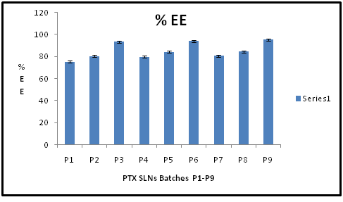 Drug entrapment efficiency is an important property in drug-loaded nanocarriers and directly affects the therapeutic effect of system. The entrapment efficiencies of all the batches have been shown in table 3 The results show that the amount of drug entrapped is increased with increase in the concentration of Stearic acid or soya lecithin. All the batches with highest concentration of Stearic acid (P3, P6 and P9) have shown highest entrapment efficiency. This may be attributed to the higher intactness of lipid. An increased concentration of soya lecithin increases entrapment efficiency by improving the film strength to increase the amount of drug in the nanoparticles. The highest entrapment was observed in batch P9 i.e. 95.46%. The higher the encapsulation capacity of nanoparticles the larger the amount of drug released at the tumor site. The graphical representation was shown in fig. 3.