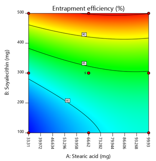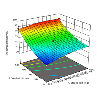 Two-dimensional contour plots and 3-D response surface plots for variables Y 1 (% EE) are shown in fig. 6 and fig. 7 respectively. Fig. 6 and fig. 7 reveal an increase in entrapment efficiency (95.465) with an increase in the amount of lipid (stearic acid) and the amount of surfactant (soya lecithin) led to increases in %entrapment efficiency. The highest entrapment efficiency was obtained with the highest amount of lipid.