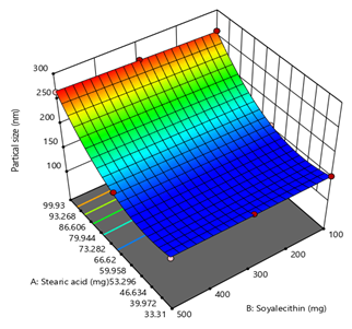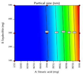 Two-dimensional contour plots and 3-D response surface plots for variables Y2 (Particle size) are shown in fig. 8and fig. 9 respectively. Fig. 8 and fig. 9 reveals that an increase in the amount of lipid led to an increase in particle size (265.06±1.40 nm). The lowest particle size was reported with the highest amount of surfactant and the lowest amount of lipid reveal a decline in particle size (149.53±4.14 nm) with an increase in the amount of surfactant. But the effect of surfactant (soya leithin) was less on particle size Y2 than the effect of Lipid (stearic acid).